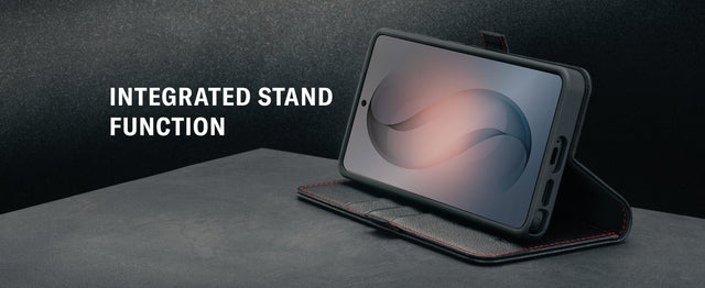 The Galaxy S26 Ultra case features an integrated stand function facilitating horizontal screen viewing. The case also features 3 credit card slots as well as a larger compartment for notes. The side magnetic clasp ensures a secure closure while maintaining an overall slim profile.